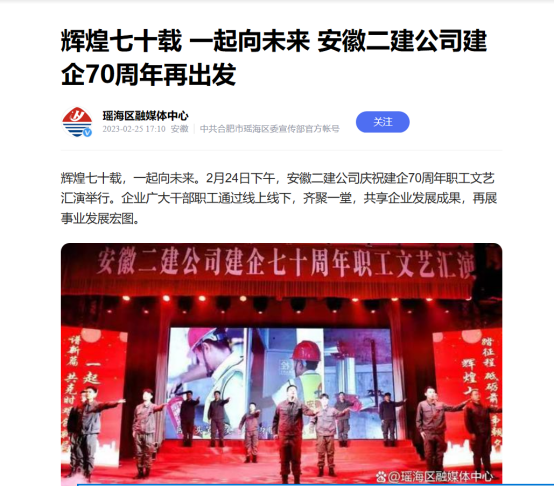 辉煌七十载,一起向未来。2月24日下午,安徽二建公司庆祝建企70周年职工文艺汇演举行。企业广大干部职工通过线上线下,齐聚一堂,共享企业发展成果,再展事业发展宏图。