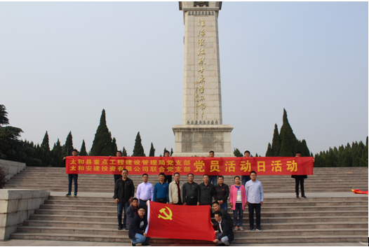 红色之旅途中,太和安建投资有限公司联合党支部书记高伟发起了党员和入党积极分子共同参与的组织生活会,从思想、党性认识上对党员和入党积极分子进行了重大洗礼。太和县委办副主任、太和县重点局苗玉勇给本次活动致辞,并给纪念碑献花蓝,接着薄局带领我们重温入党誓词,积极学习党的历史、党的知识。