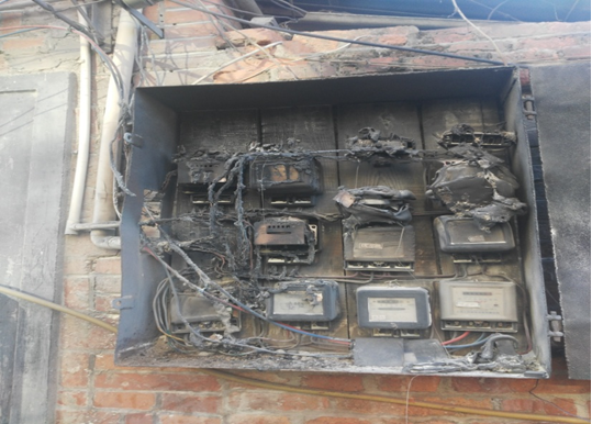 7月21日清晨5点,后勤综合服务部物管办接到原二分公司生活基地管理员紧急电话,生活区平3栋电表箱因持续高温用电负荷增大,线路老化严重造成电表自燃,表箱整体烧毁。由于消防器材的配备完善,平时对居民防火意识的宣传到位,扑救及时,未造成重大火灾及财产损失。接到电话后,后勤物管办立即安排专业技术人员赶赴现场,对事故现场进行全面的排查检修,在不影响整个小区居民正常用电的情况下,首先断开这一栋平房主电源解除安全隐患,在本着以最快速度解决问题和节约成本的前提下,对现场进行了梳理,就地制定解决施工方案并及时汇报领导实施操作。
