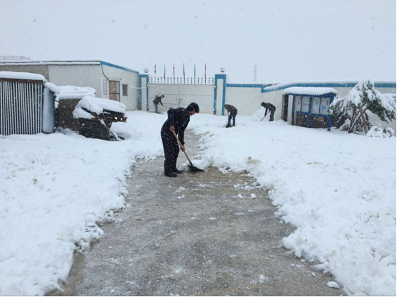 近日,阿尔及利亚康斯坦丁接连下了几场大雪,雪花翩跹飞舞,康斯坦丁大地一片银装素裹。为了防止路面结冰,方便人员出行,1月19日早晨,在项目部经理章恒旭的带领下,康斯坦丁6000套项目部全体管理人员顶风冒雪、齐心协力上路清理项目部院内及道路积雪。