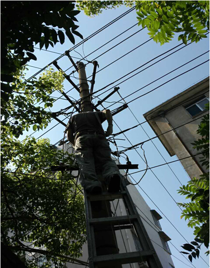 ,原二公司生活基地由于供电线路严重老化,发生线路着火断电事故,后勤综合服务部接到险情报告后,立即组织抢修队伍奔赴现场,维修人员不惧高温酷暑,顶着烈日,经过几个小时的高空作业,及时恢复了供电。