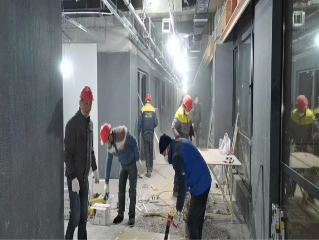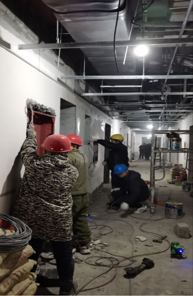 自11月底接到肥东县委县政府主要领导指示,公共卫生综合楼须提前交付,投入疫情防控使用。根据公司抢工动员大会精神,第二分公司、项目部迅速行动起来,分公司领导亲自指挥,全员行动,火速调配劳动力、材料物资、机械设备等资源力量,投入抢工战役。一天之内,编排好详细的抢工倒排施工计划、实施方案、保证措施,同时成立各作战小组,确保各项任务如期完成。截止目前,外立面装饰已完成,除五楼由院方负责外,各楼层水电消防桥架暖通空调智能化等穿线、管道设备安装已全部完成,装饰装修进入到攻坚阶段。地墙面砖已铺贴完毕,油漆涂料正在收尾。病房内吊顶正在安装,墙面冰火板已安装铺贴50%,pvc地板自流平地坪已完成浇筑,室外道排已完成一半,正在全力冲刺最后目标。在抢工同时,质量和安全也毫不放松,确保“黄山杯”创建,优化工艺,提升质量标准。安全检查日查日报,及时消除隐患。